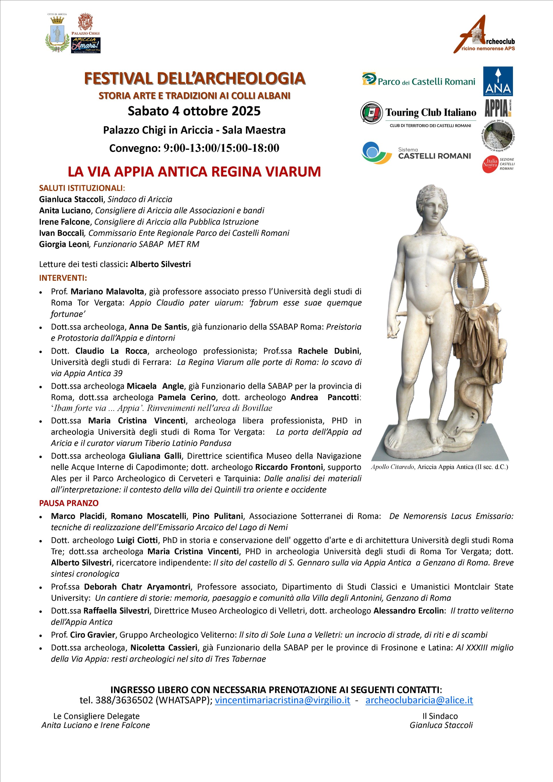 L’evento è inserito nel progetto del Comune di Ariccia, “Ariccia da amare”, ed è patrocinato dal Comune di Ariccia, dal Parco Regionale dei Castelli Romani, dal Sistema Castelli Romani, dall’ANA (Associazione Nazionale Archeologi), dal Club di Territorio dei Castelli Romani del Touring Club Italiano, ed è inserito nella manifestazione “Appia Day” (https://www.touringclub.it/notizie/touring-club-italiano/appia-day-2025-festa-lungo-la-regina-viarum-in-quattro-regioni-italiane).