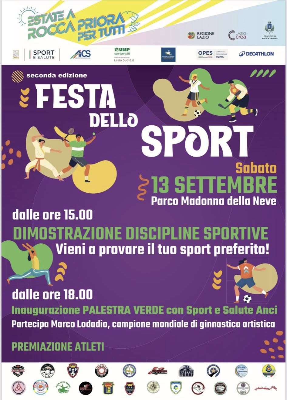 A Rocca Priora, la seconda edizione della Festa dello Sport, sabato 13 settembre, dalle ore 15:00 alle 19:00 offrirà un pomeriggio dedicato al benessere, all’attività fisica e alla prevenzione.